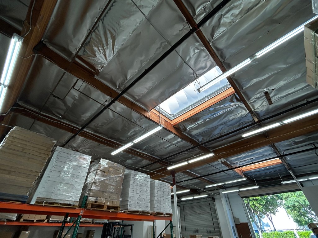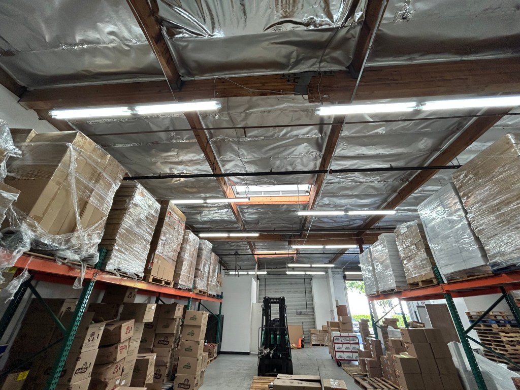 Tenant improvement of this warehouse consisted of demolition of walls to expand warehouse space, demolition of T-bar ceiling, removal of office lights, and re-wiring light switches. New Installation consisted of framed walls, new doors, new shop lights and a radiant barrier